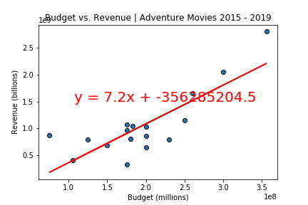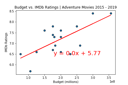 The adventure genre provided the most insight, where the r-value between revenue and budget was 0.82. This suggests that the relationship between budget and revenue for adventure films is very significant, where they are strongly correlated. The r-value between budget and ratings was .68. This suggests a moderate to strong relationship, where values are strongly correlated, between the budget of adventure films and the IMDb ratings they receive.