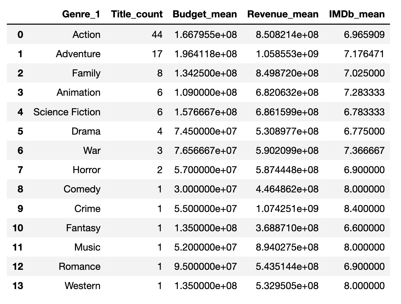 We found the most insight from the adventure genre, with the other three genres showing weaker relationships. However, this dataset was relatively small with only 99 films appended. With a larger dataset of films spanning 10 to 20 years, a more comprehensive analysis on the relationship between budget, revenue, and ratings could reveal stronger conclusions.