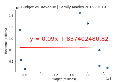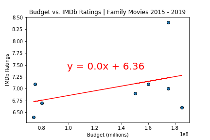 The family film genre provided little to no insight, where the relationship between budget and revenue was insignificant with an r-value of .01. The relationship between budget and IMDb ratings is slightly more apparent with an r-value of .40. However, this still suggests a weak relationship between the budget of family films and the IMDB ratings they receive. Since this analysis only covered 8 films in the family film category, a larger distribution could have provided more insight.